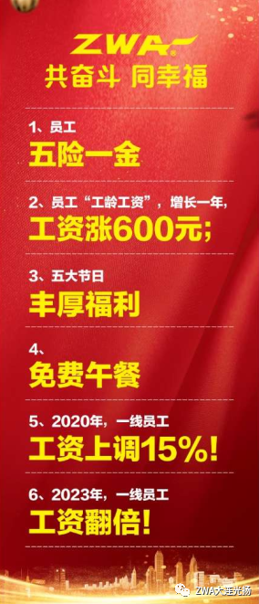 然而,在“裁員降薪”的洪流中,ZWA卻成為了為數(shù)不多的逆行者:公司決定從2020年3月份起,將所有一線員工的工資上調(diào)15%!這是ZWA的底氣!更是ZWA的擔(dān)當(dāng)!